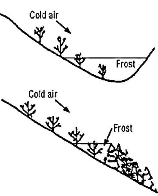 Grape plants require three years (from one-year-old plants) to become established and produce maximum yields. Grapes are deep-rooted. They quickly grow roots six to eight feet deep in a well-drained, sandy-loam soil. Soil preparation ensures success. Grapes, although fairly tolerant of soil types and pH, do best in a pH of 5.5 to 6.5. American and French hybrid cultivars will tolerate a more acidic (low pH) soil than Vinifera cultivars which grow and produce best in higher pH soil of 6.2 to 6.5. Sunlight exposure is a very important factor in site consideration. Full sun is critical for healthy vines and fruit sweetness. Never locate vines in a frost pocket (see graphic on left). Freezing temperatures in spring can damage or destroy flower buds and clusters. Unusually cold spring weather will reduce pollination and prevent grape formation.