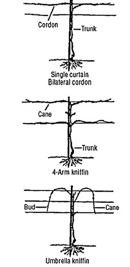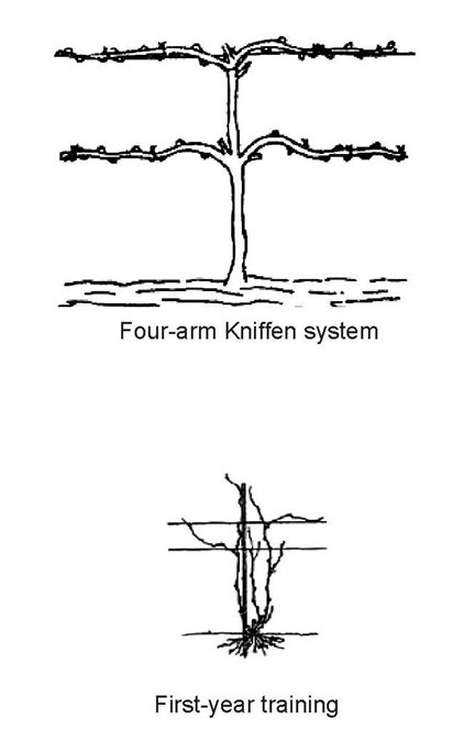 - Four-arm Kniffen System - One of the easiest and most popular, this system consists of four canes, two on each side of the trunk, trained onto two trellis wires. Two parallel and horizontal wires are stretched between posts for support of the vine. The lower wire is 36" above the ground, and the higher is 60" above the ground. After planting, the strongest cane should be cut back to three to six strong buds. Allow only the most vigorous shoot to develop. The young vine is loosely tied to the lower wire, and all other shoots below the wire are removed. When the shoot grows to the higher wire, it is loosely tied to it. The shoot is then cut off above the top wire. The second year, eight of the most vigorous canes located near the two wires are chosen . The four most vigorous will be the arms and are pruned to five to 12 buds. The other four will be pruned back to four to six buds. These are the renewal spurs. On the mature vine, there are always four canes selected at pruning time. Fruit for the coming year comes from shoots that develop from the buds on these canes. Mature, pruned vines also include four renewal spurs selected to be the fruiting canes for the following winter.