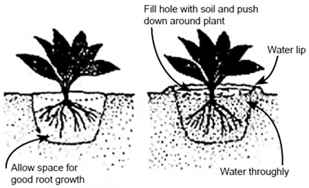 Dig a hole that allows transplants to be at the same soil level as in the container. Loosen and spread roots to encourage new outward root development. Water immediately after planting.