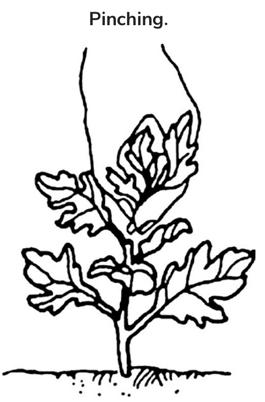 When growing annuals from seed, pinch young seedlings to increase the number of blooms. When young plants are two to four inches tall and have three to four sets of leaves, pinch out the central stem as shown in the illustration. This encourages side branches that produce a bushier plant that can support more flowers.