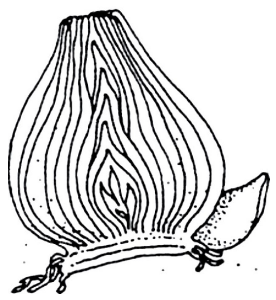 True Bulbs. A true bulb consists of a modified underground stem surrounded by modified leaves that contain stored food for the plant. There are two types of bulbs - tunicate and scaly. Tunicate bulbs have a paper-like covering or tunic that protects the scales. Inbricate bulbs have scales that are not protected and therefor care is needed so that they don’t dry out. Daffodils and tulips are examples of tunicate bulbs, and lilies (not daylilies) are inbricate types.